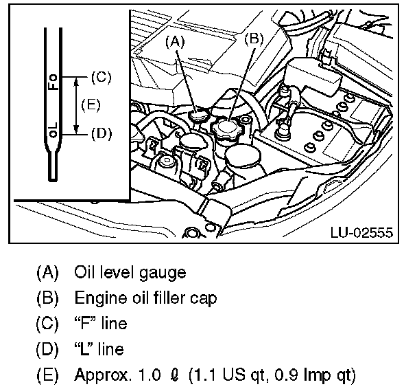 11) After the engine stops, recheck the oil level. If necessary, add engine oil up to the "F" line on level gauge.