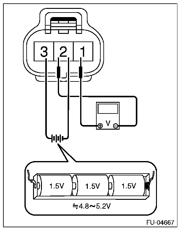 2. Connect dry-cell battery positive terminal to terminal No. 3 and dry-cell battery ground terminal to terminal No. 1, circuit tester positive terminal to terminal No. 2 and the circuit tester negative terminal to terminal No. 1.