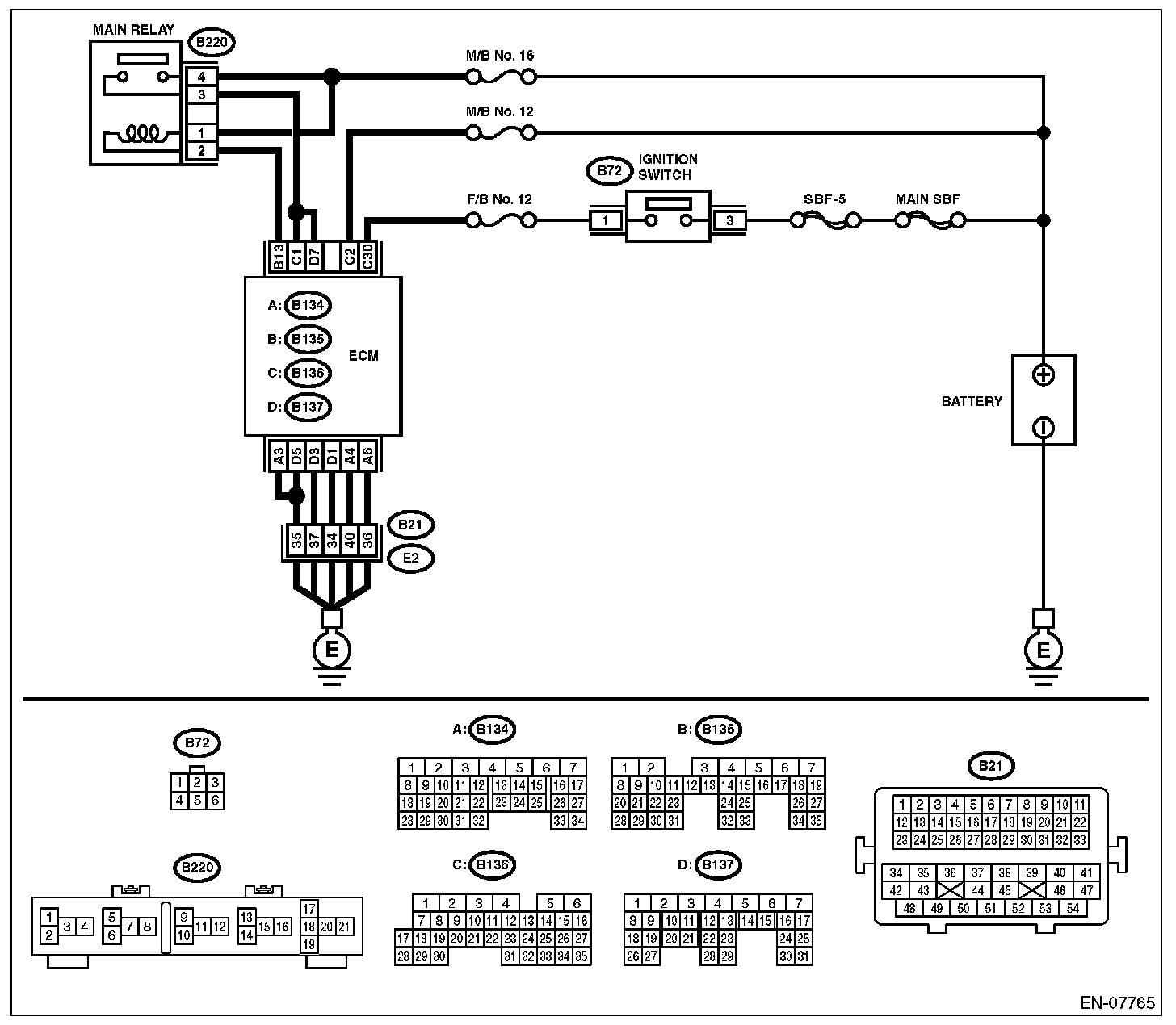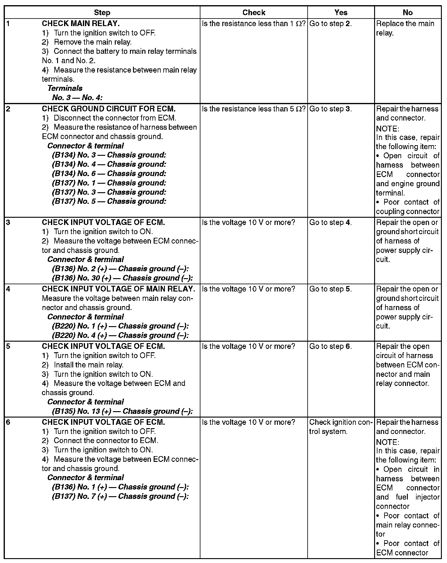 CHECK POWER SUPPLY AND GROUND LINE OF ENGINE CONTROL MODULE (ECM)CAUTION: After servicing or replacing faulty parts, perform Clear Memory Mode Clear Memory Mode, and Inspection Mode Preparation For the Inspection Mode