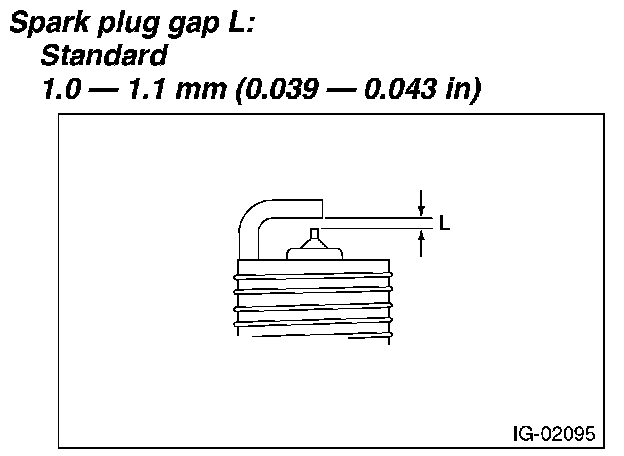 3. Using a nylon brush, etc., clean and remove the carbon or oxide deposits from the spark plug. If deposits are too stubborn, replace the spark plugs. After cleaning the spark plugs, check the spark plug gap "L" using a gap gauge. If it is not within the standard, replace the spark plug.