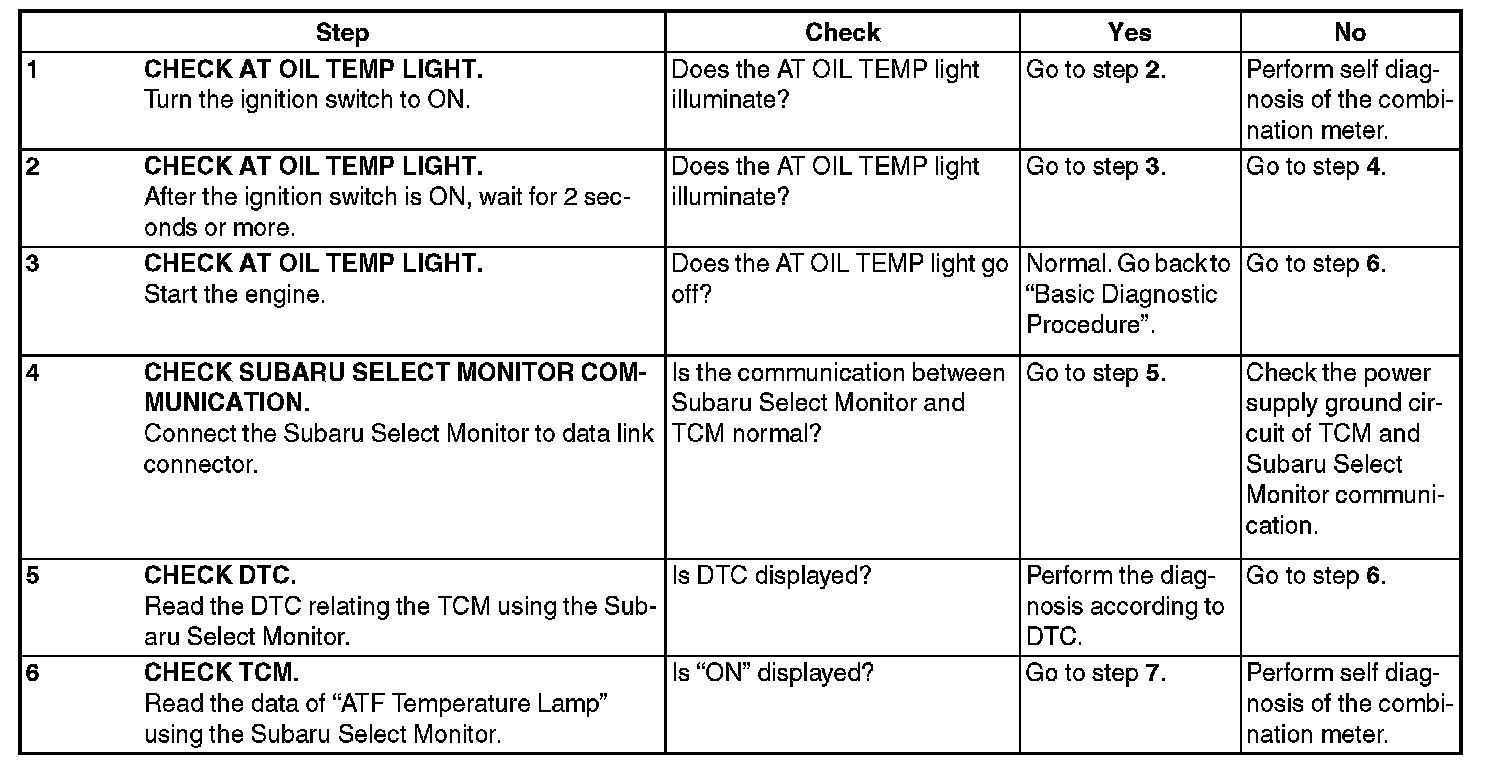 When any on-board diagnostics item is malfunctioning, or the learning has not yet completed, AT OIL TEMP light blinks. Blinking continues from the engine start to the ignition switch OFF. The malfunctioning part or unit can be determined by a DTC. Problems which occurred previously can also be identified through the memory function. If the AT OIL TEMP light does not blink although a problem is occurring, the problem can be determined by checking the performance characteristics of each sensor using the Subaru Select Monitor. If the learning has not yet completed, "AT learning not completed" is displayed when the Subaru Select Monitor is connected while AT OIL TEMP light is blinking. The AT OIL TEMP light blinking will go off, when the learning is performed. Indicator light signal patterns are as shown in the figure.