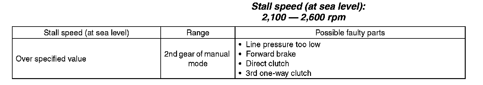 ^ If the stall speed is higher than the specified range, attempt to finish the stall test in as short a time as possible, in order to prevent the automatic transmission from sustaining damage.