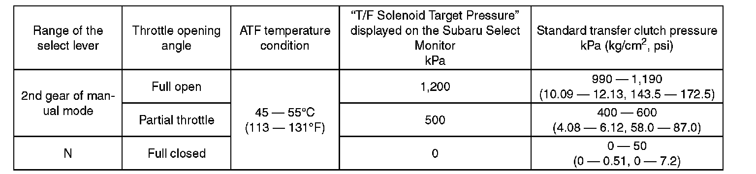 ^ After performing the transfer clutch pressure test, be sure to cool down the engine for at least one minute with the select lever set in the "P" or "N" range, and at an idle speed of 1,200 rpm or less.