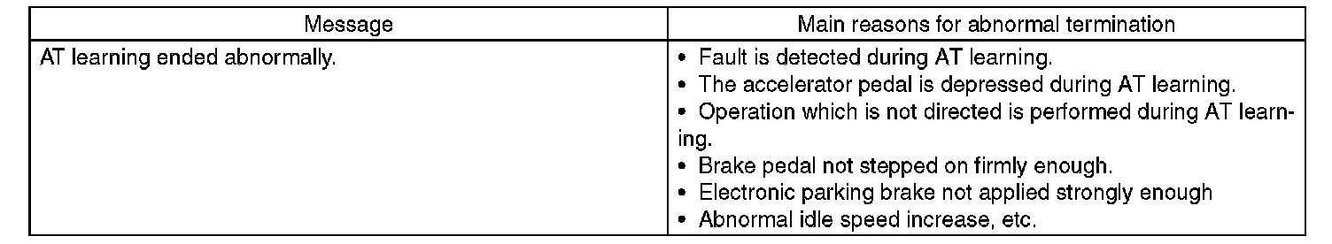 During "SHIFT control system learning in progress" and "AWD control system learning in progress", AT OIL TEMP light in the combination meter starts blinking at 2 Hz and the learning operation starts. The following message is displayed on the screen when the AT OIL TEMP light in the combination meter goes off. When the learning ended abnormally, AT OIL TEMP light blinks at 4 Hz.