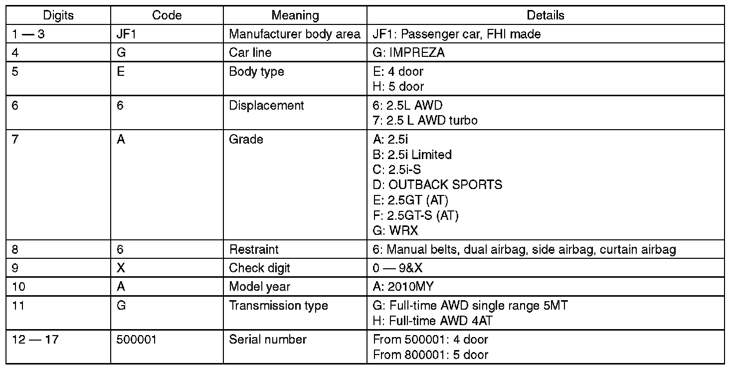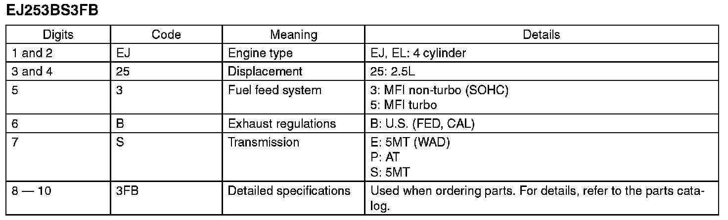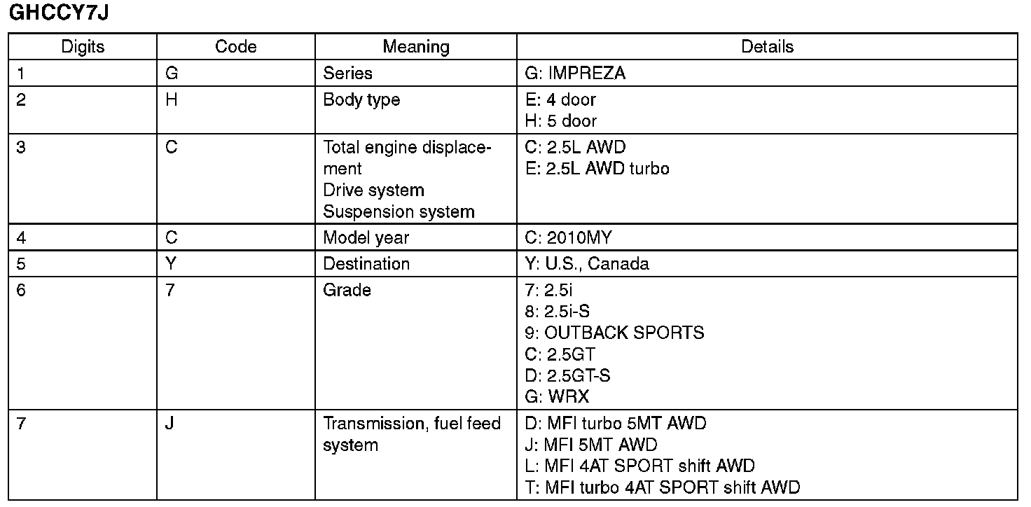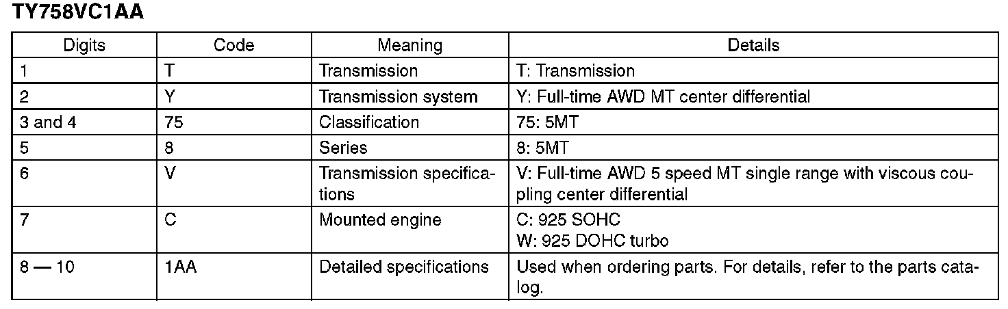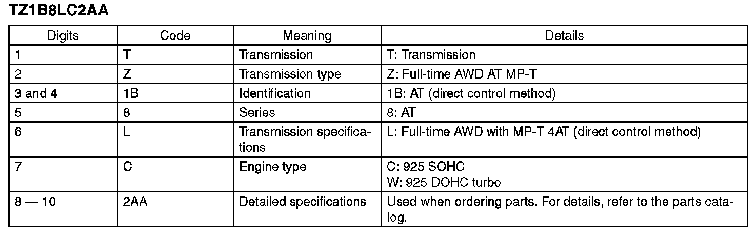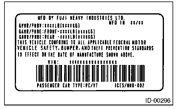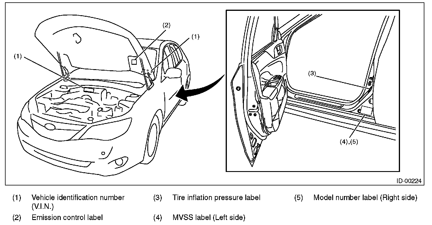 The model number label indicates: the applied model, the option code, the trim code, the engine type, the transmission type, and the exterior color code. This information is helpful when placing orders for parts.
