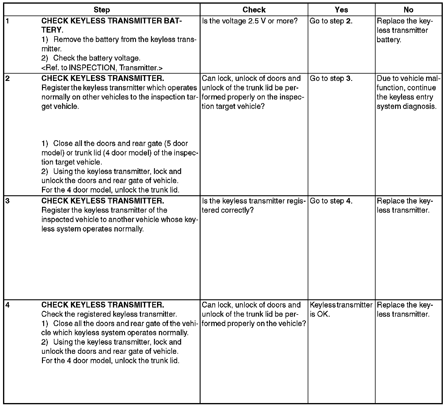 Keyless Entry SystemCHECK KEYLESS TRANSMITTER BATTERY AND FUNCTION