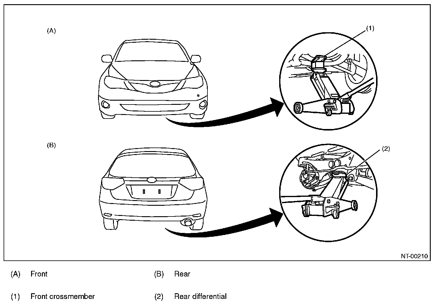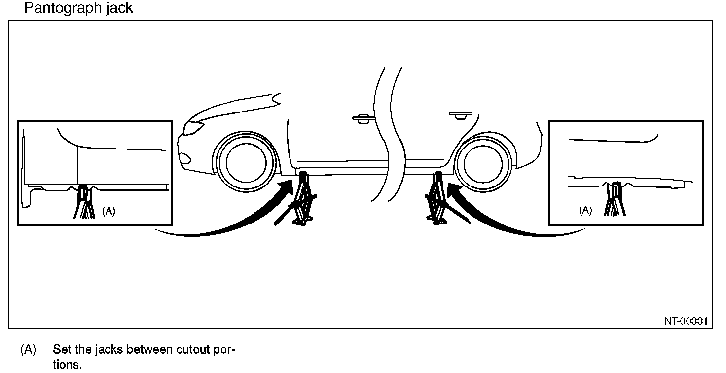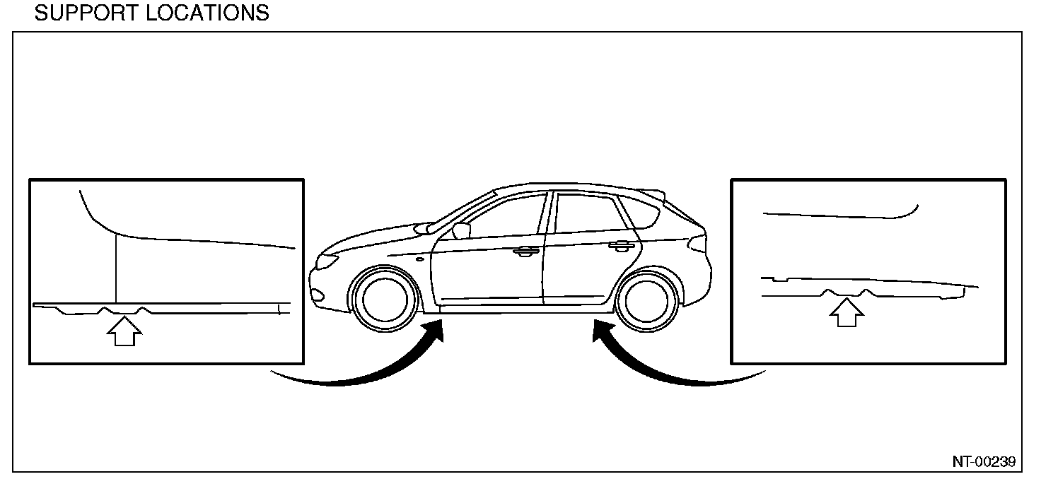 The figure of vehicle indicates the supporting locations, supporting procedures, etc. for 5 door model, and they are same for 4 door model.