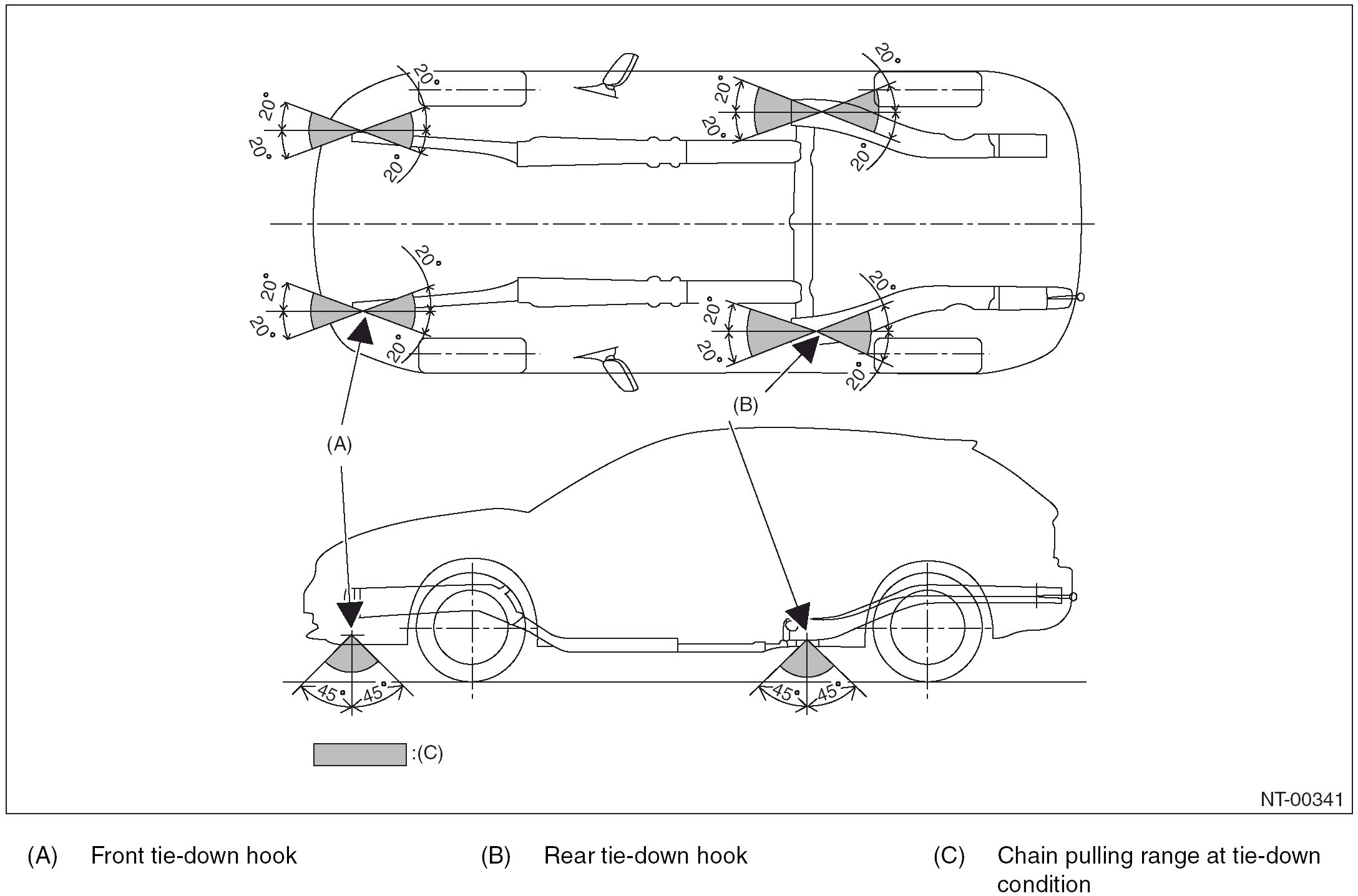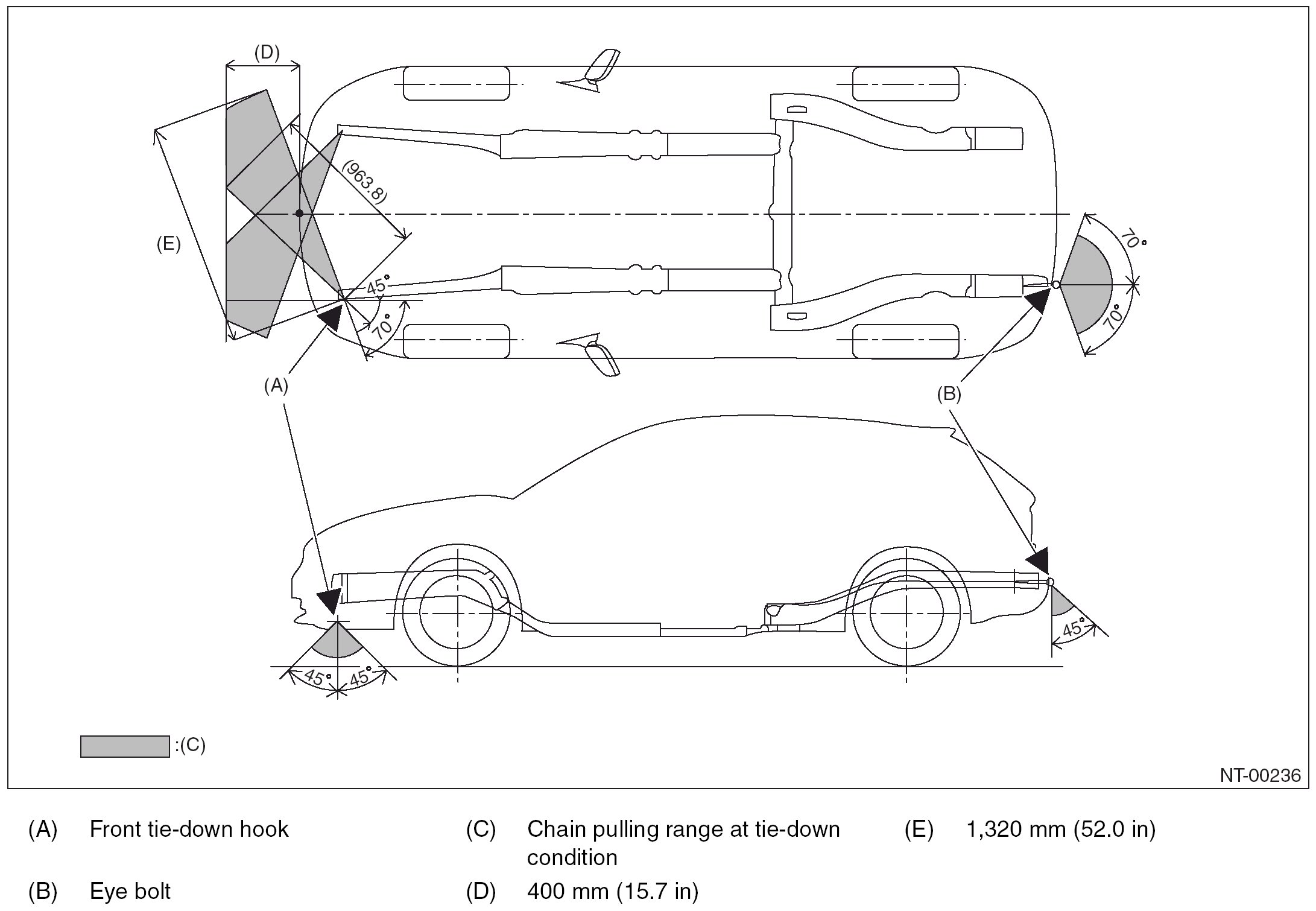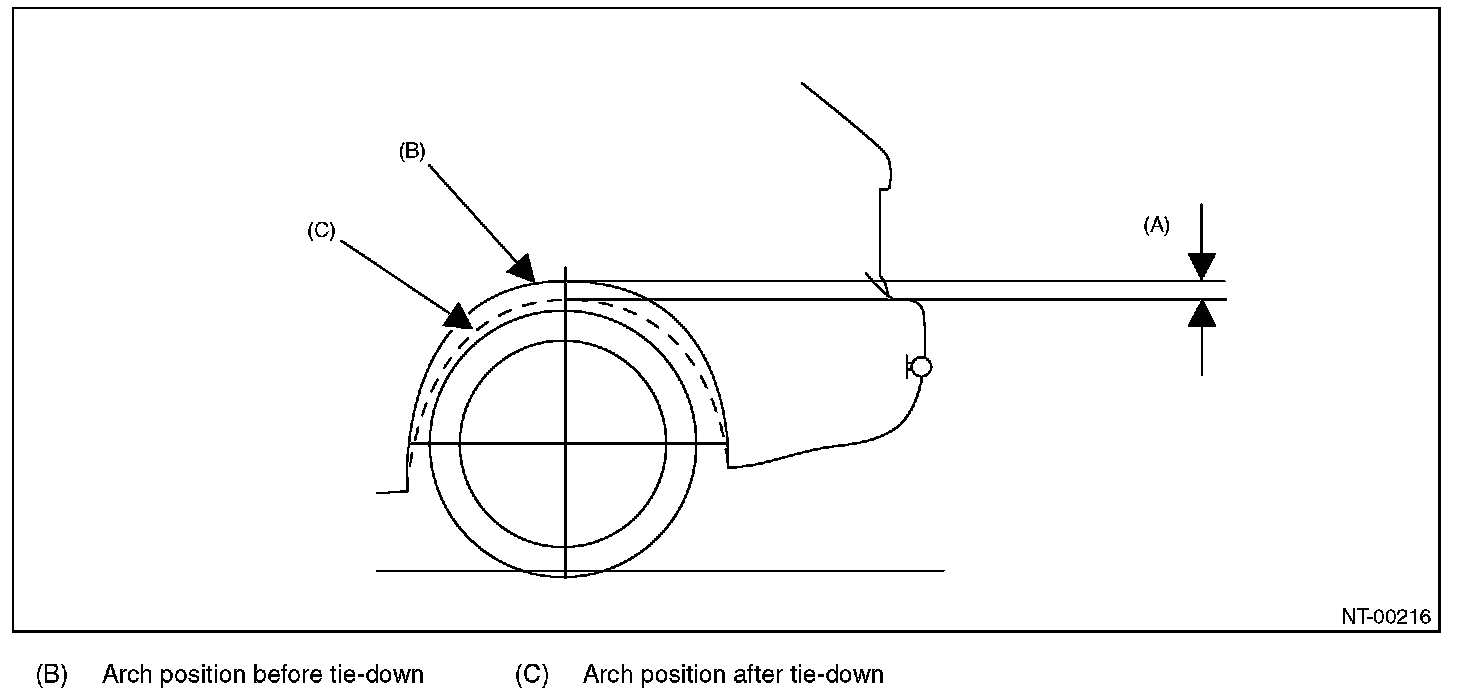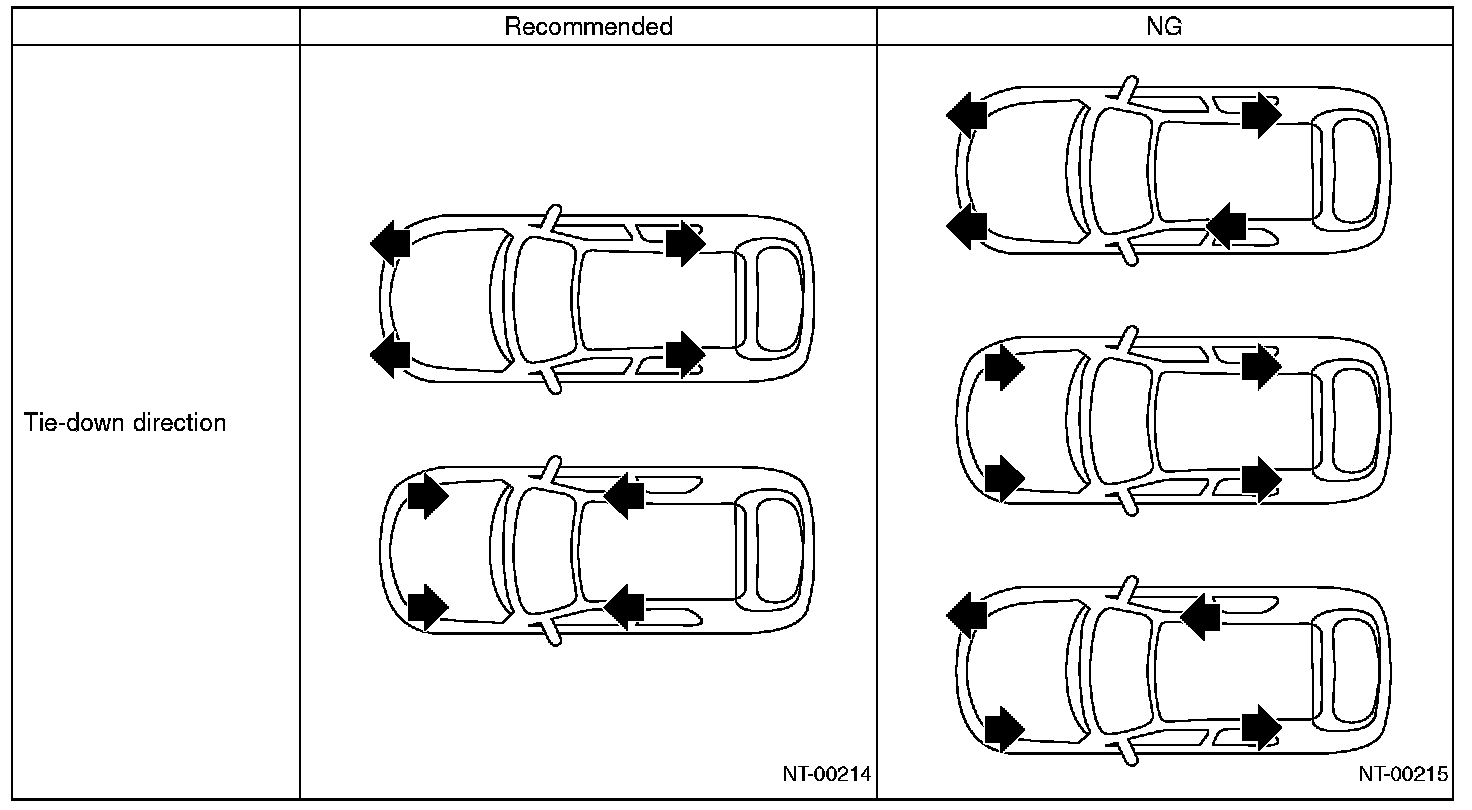 CAUTION: The vehicle sinking volume at tie-down condition should be less than 50 mm (1.97 in) and make sure to fix the vehicle securely. Check to see if the tensions of chains or belts at tie-down condition are appropriate in the following procedures.