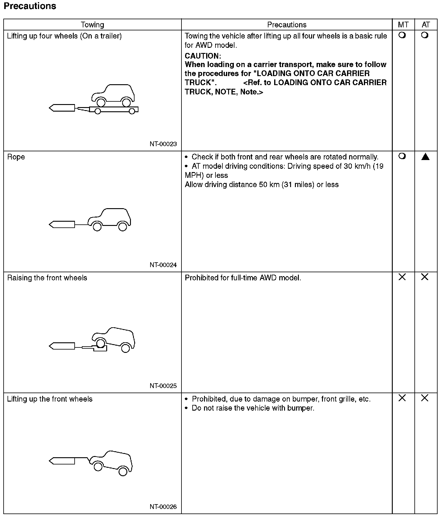 Avoid towing vehicles except when the vehicle cannot be driven. For models with AWD and AT, use a car carrier truck instead of towing. When towing other vehicles, pay attention to the following to prevent hook or vehicle damage resulting from excessive weight.
