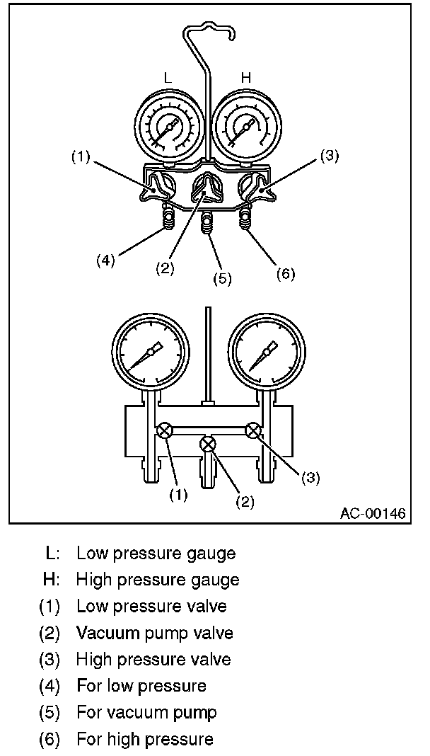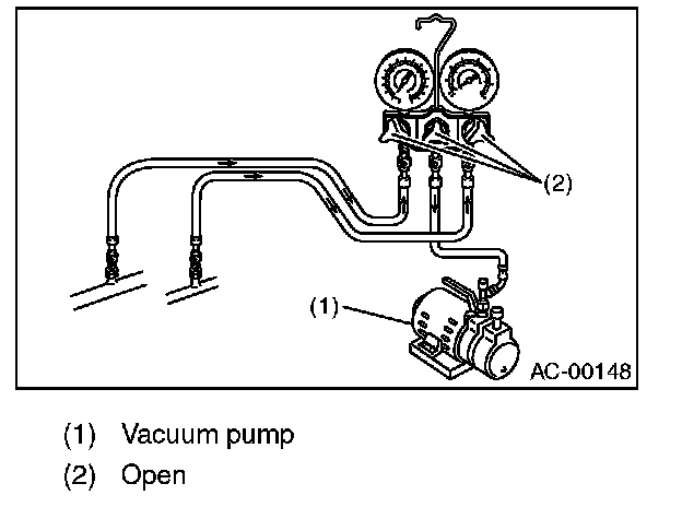 4. Operate the vacuum pump and open the low pressure and high pressure side valves. Next, open the center manifold hose valve, and begin evacuation.