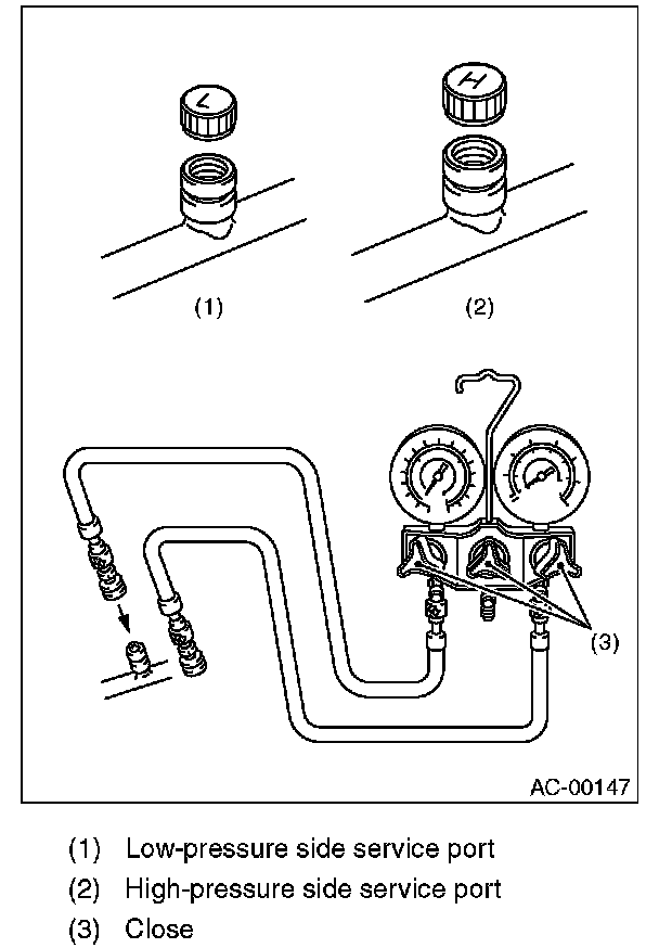 CAUTION: When filling with the engine running, do not open the high pressure side valve. Always fill from the low pressure side valve.