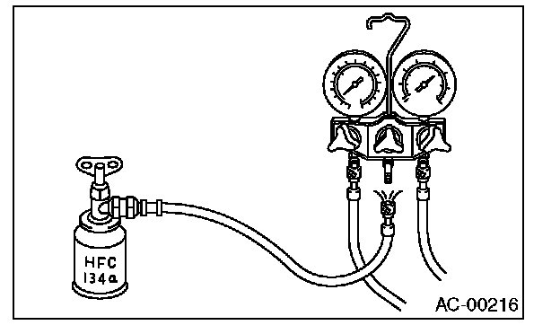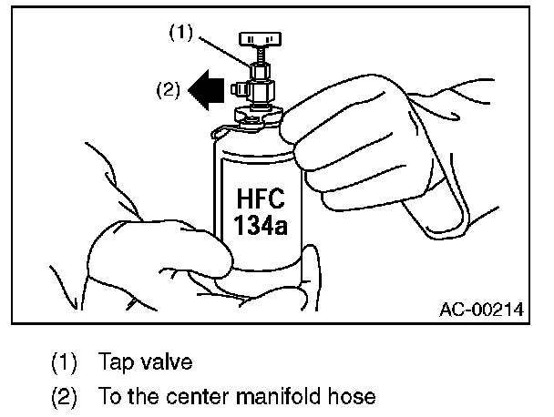 18. If the HFC-134a supply container becomes empty, close all valves, and close the can tap valve to replace the empty container. After replacing with a new HFC-134a supply container, perform air purge, and resume the filling operation.