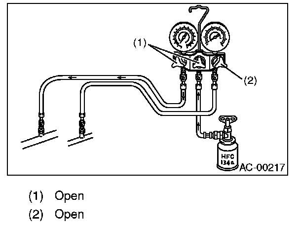 14. Open the high pressure side and low pressure side valves of the manifold gauge to fill with refrigerant.
