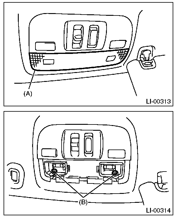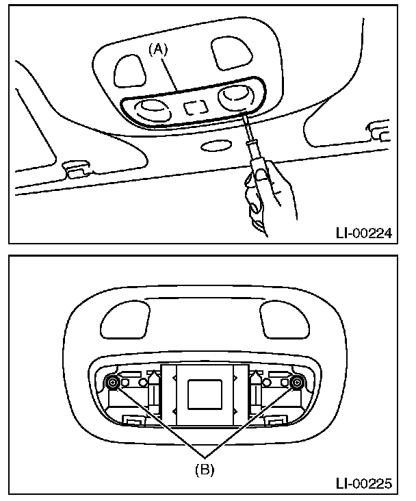 2. Remove the lens (A) and spot map light mounting screws (B).
