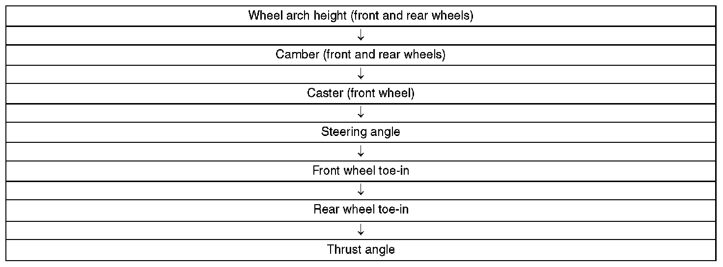 Check, adjust and measure the wheel alignment in accordance with the procedures indicated in the figure.
