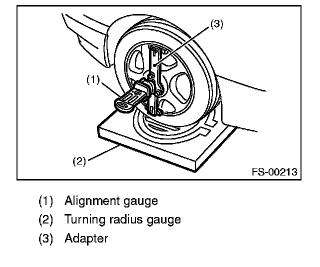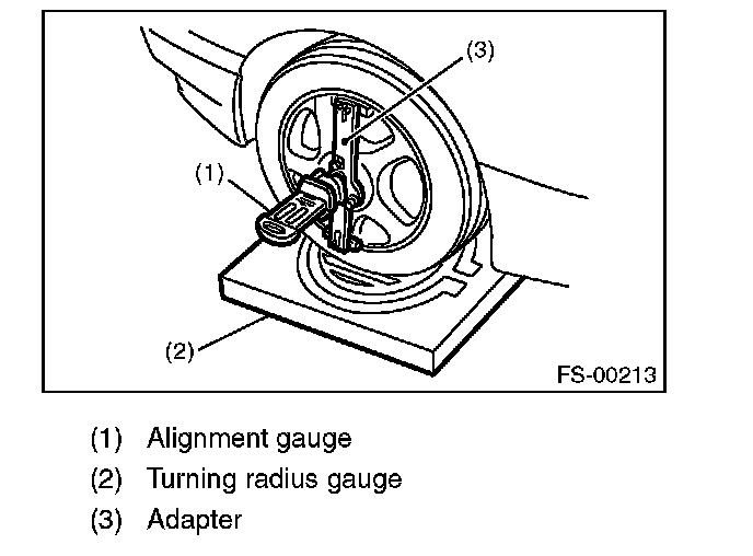 1) Place the front wheel on the turning radius gauge. Make sure the ground contact surfaces of the front and rear wheels are at the same height.