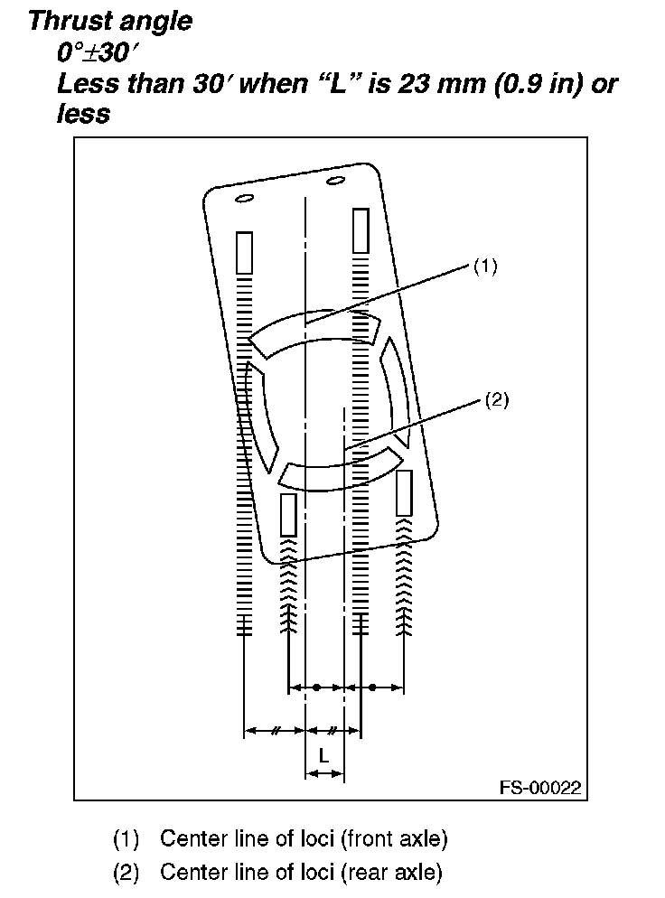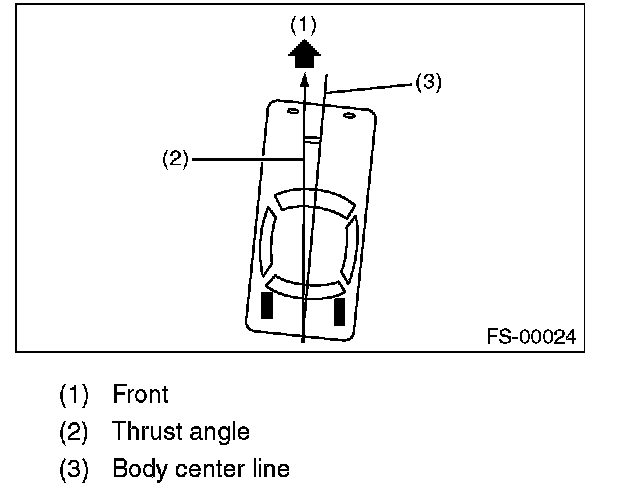 Thrust angle is a mean value of left and right wheel toe angles in relation to the vehicle body center line. Vehicle is driven straight in the thrust angle direction while slanting in the oblique direction depending on the degree of the mean thrust angle.