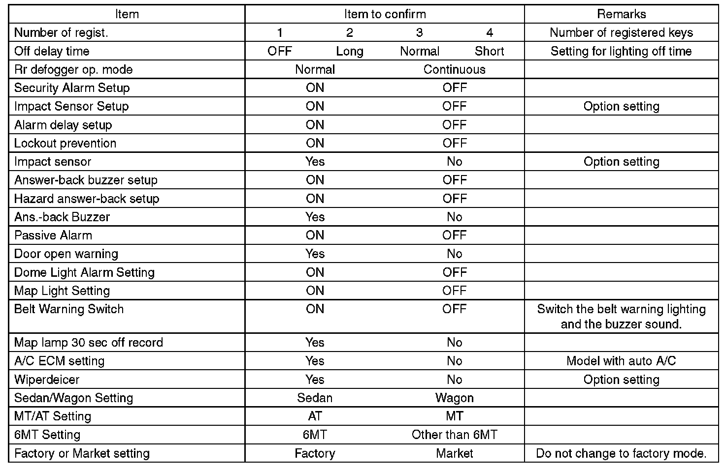 - Be sure not to change Factory or Market setting except when installing a new body integrated unit.