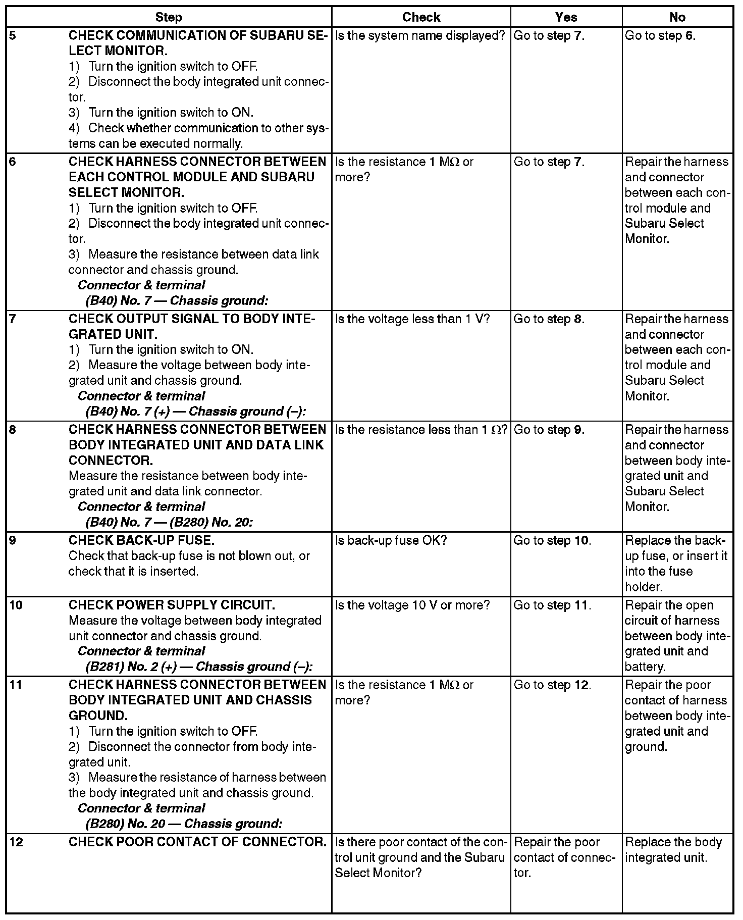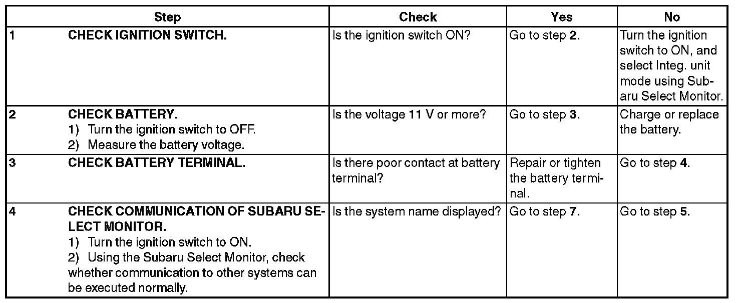 In order to check the body integrated unit function, inspect the body integrated unit and actuator using Subaru Select Monitor without operating switches.