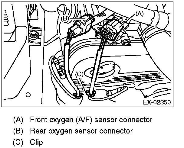 4. Remove the clip fastening the harness and disconnect the front oxygen (A/F) sensor connector.