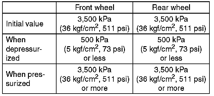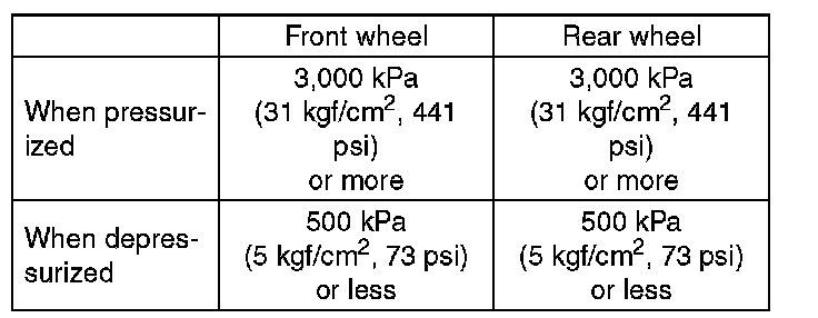 7) Read values indicated on the pressure gauge and check if the fluctuation of the values between decompression and compression meets specification. Depress the brake pedal and check that it is not abnormally hard, and tightness is normal.