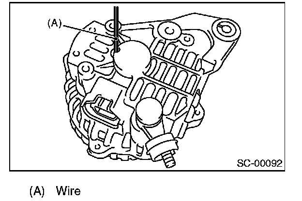 Before assembling, press the brush down into the brush holder, then fix the brush in that position by inserting a [1 mm (0.04 in) dia., 40 - 50 mm (1.6 - 2.0 in) long] wire through the hole as shown in the figure.