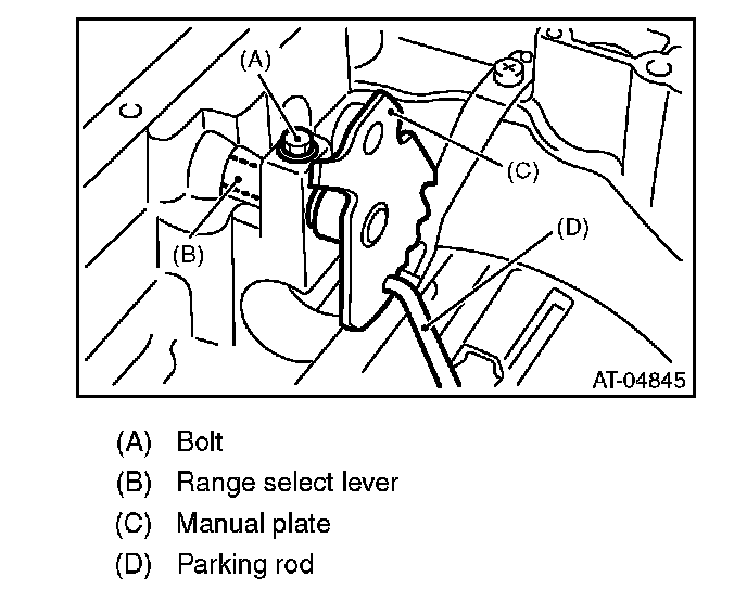 12) Remove the bolts securing select lever, and then remove the select lever, manual plate and parking rod.