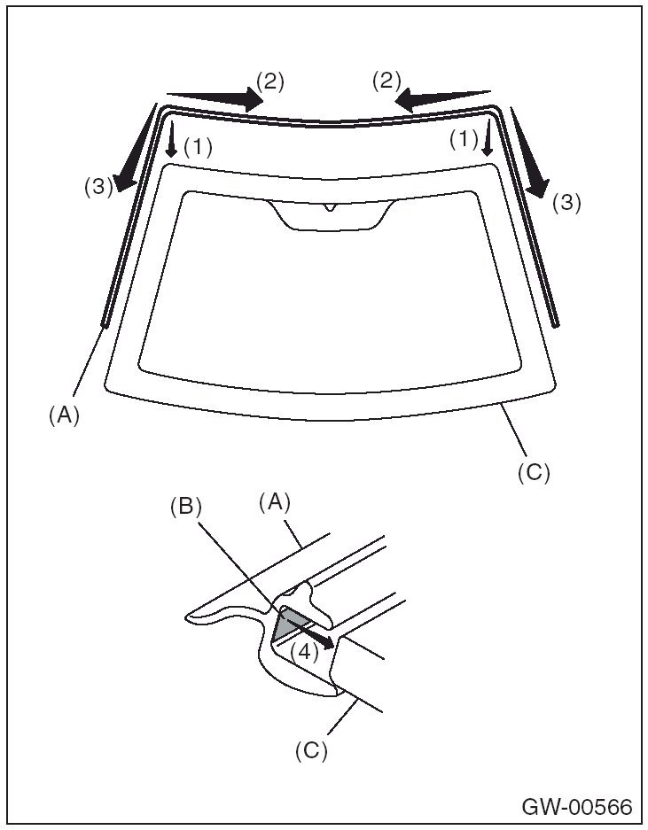 1. Align the molding (A) with both ends of the upper edge of the windshield glass (C).
