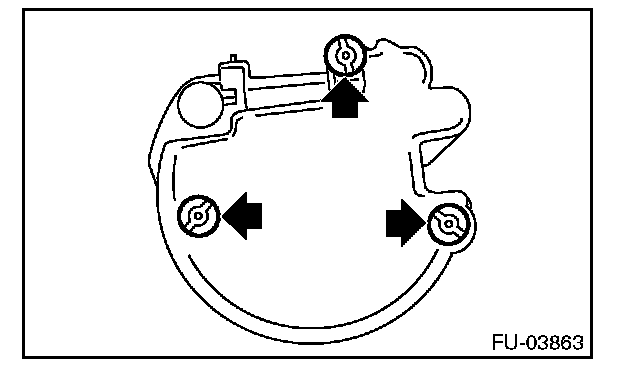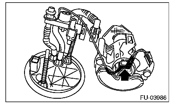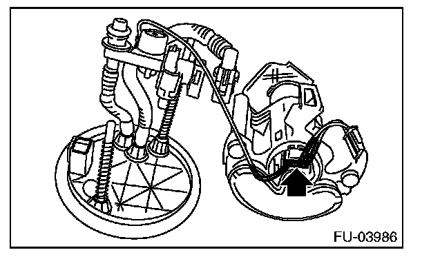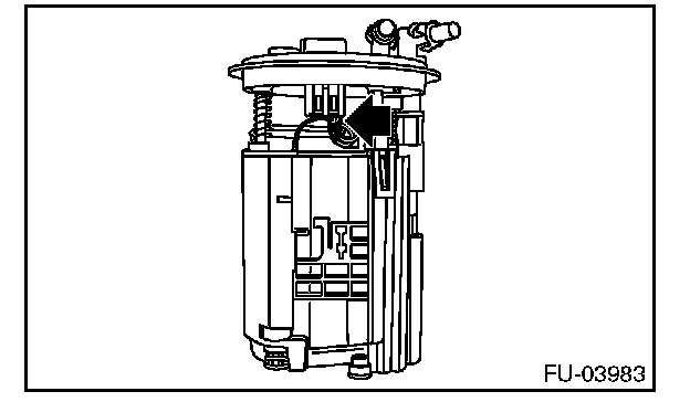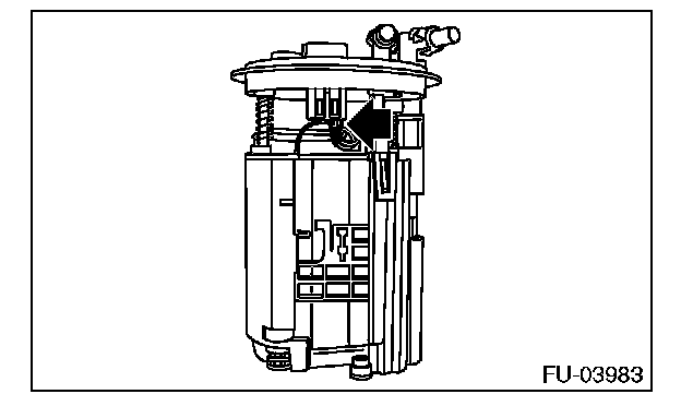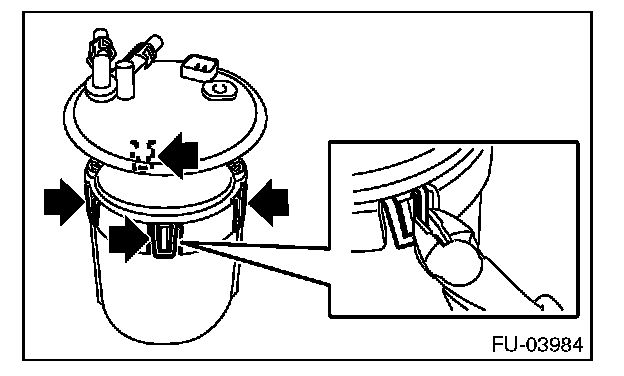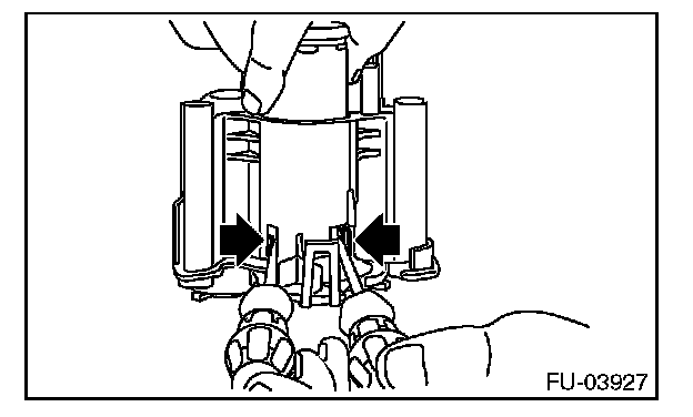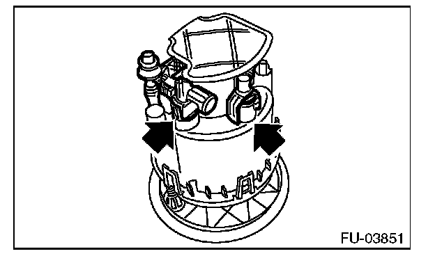 8. Lift the two claw holding portions where the pump assembly is connected to the fuel filter using a flat tip screwdriver [dia.approx.3 mm (0.12 in)] to disconnect the fuel filter and pump assembly.
