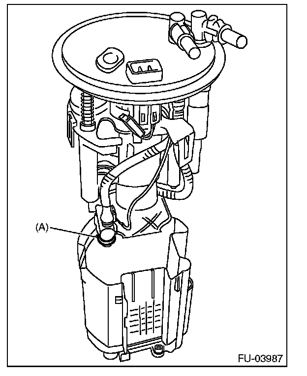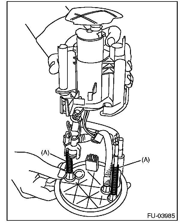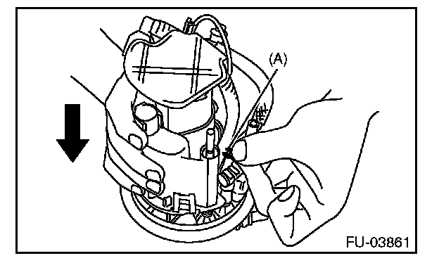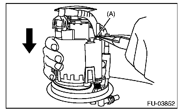 6. Push down the fuel filter assembly in the arrowed direction to remove clip (A), and then disconnect the sub tank bracket assembly and fuel filter assembly.