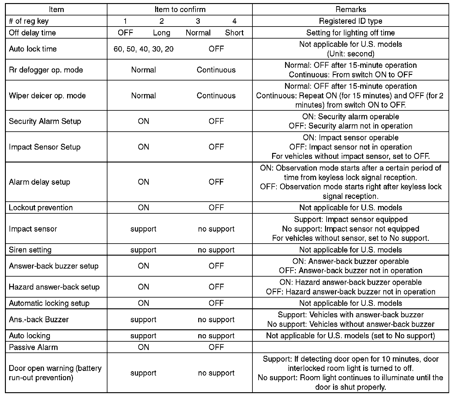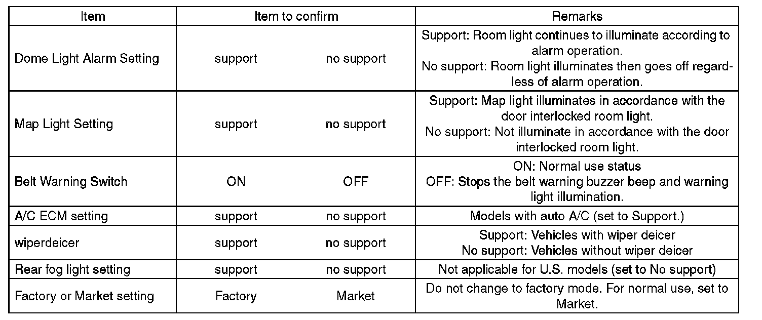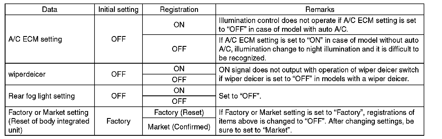 - Confirm key illumination does not blink or "Factory or Market setting" of body integrated unit registrations is "Market". If "Factory initial setting is set to "Factory," key illumination blinks when ignition key is ON, to notify that the settings are unconfirmed.