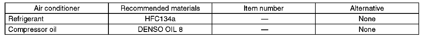 Standard air conditioners on Subaru vehicles use HFC134a refrigerant. Do not mix it with other refrigerants. Also, do not use any compressor oil other than DENSO OIL 8.