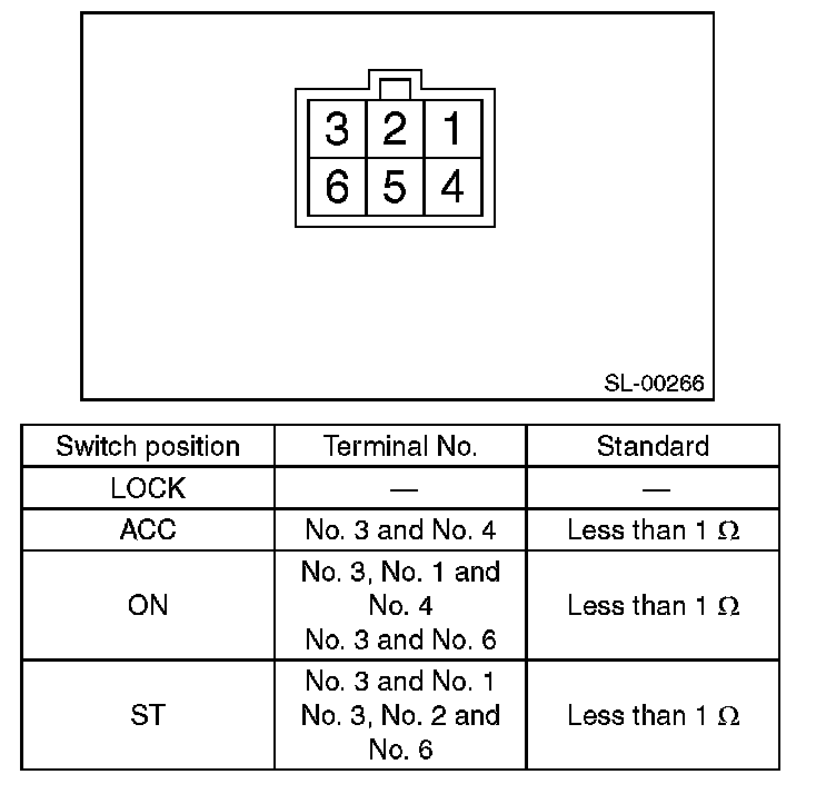 4. Turn the ignition key plate to each position and check the continuity between terminals of ignition connector.