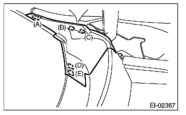 1. Detach tabs (A), (B), and (C) from the vehicle exterior.