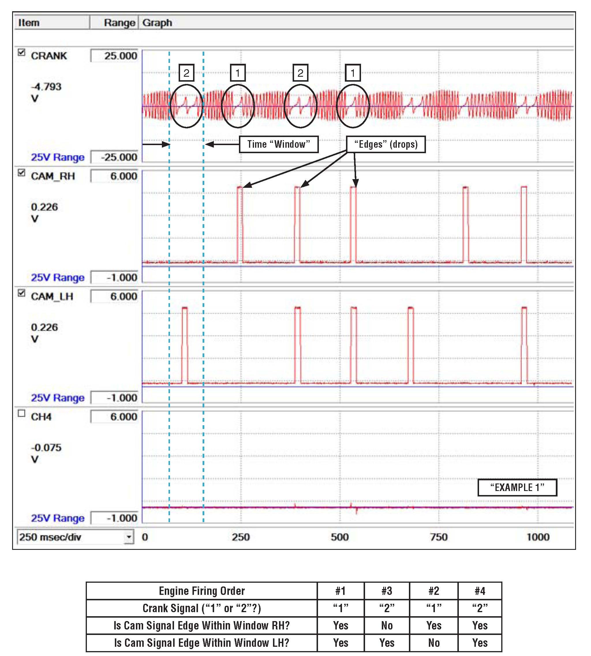 Looking at the crank signal, you will see the difference between what we will call "1's" (a single spike) and "2's" (a double spike). This helps establish the engines firing order and what the corresponding cam sensor data should look like. The ECM looks for the "Edges" of the cam position sensor voltage drops to be within specified time "Window" parameters. The chart Example 1 will help bring this all together. (Range was set to 250 msec / div. so the crank signal would be easier to understand here.)