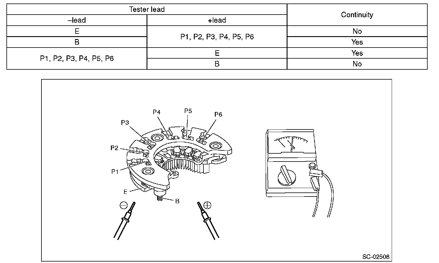 1. Check for continuity between the diode lead and terminal E or B. If continuity is not as shown in the table, replace the rectifier.