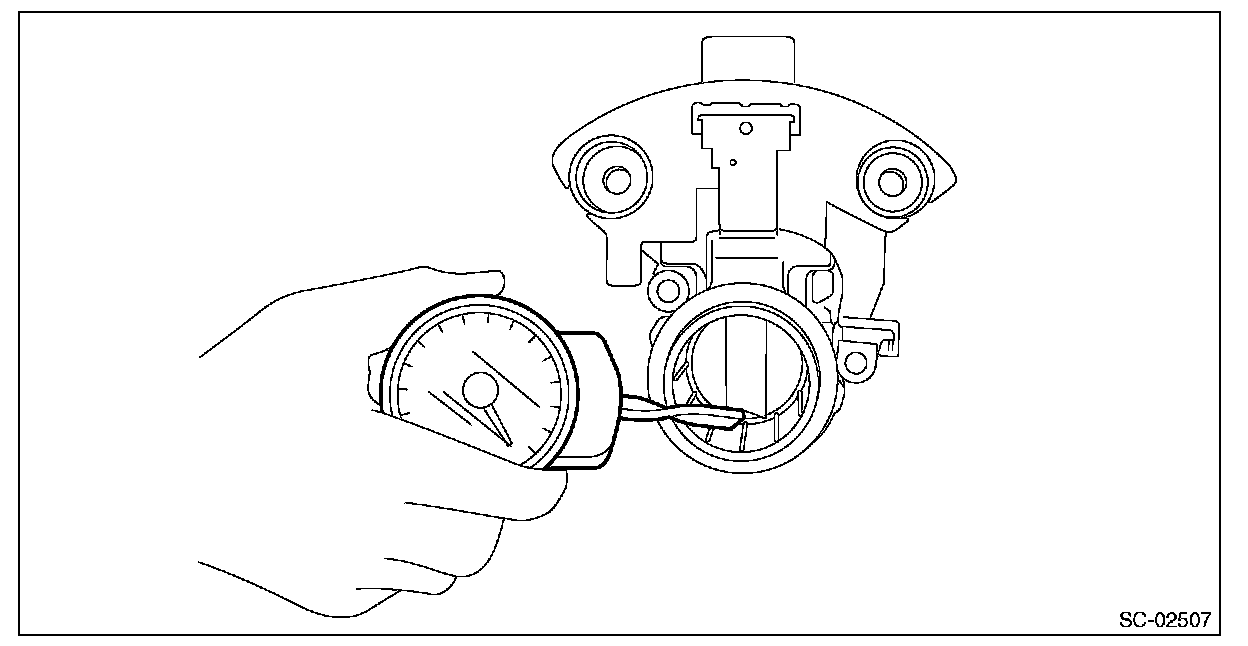 2. Check that there is appropriate pressure on the brush spring. Using a spring pressure indicator, push the brush into the brush holder until its tip protrudes 2 mm (0.0787 in). Then measure the pressure of brush spring. If the pressure is 1.7 N (173 gf, 6.11 ozf) or less, replace the brush spring. 4.1 - 5.3 N (418 - 540 gf, 14.75 - 19.06 ozf) pressure is required on the new spring.
