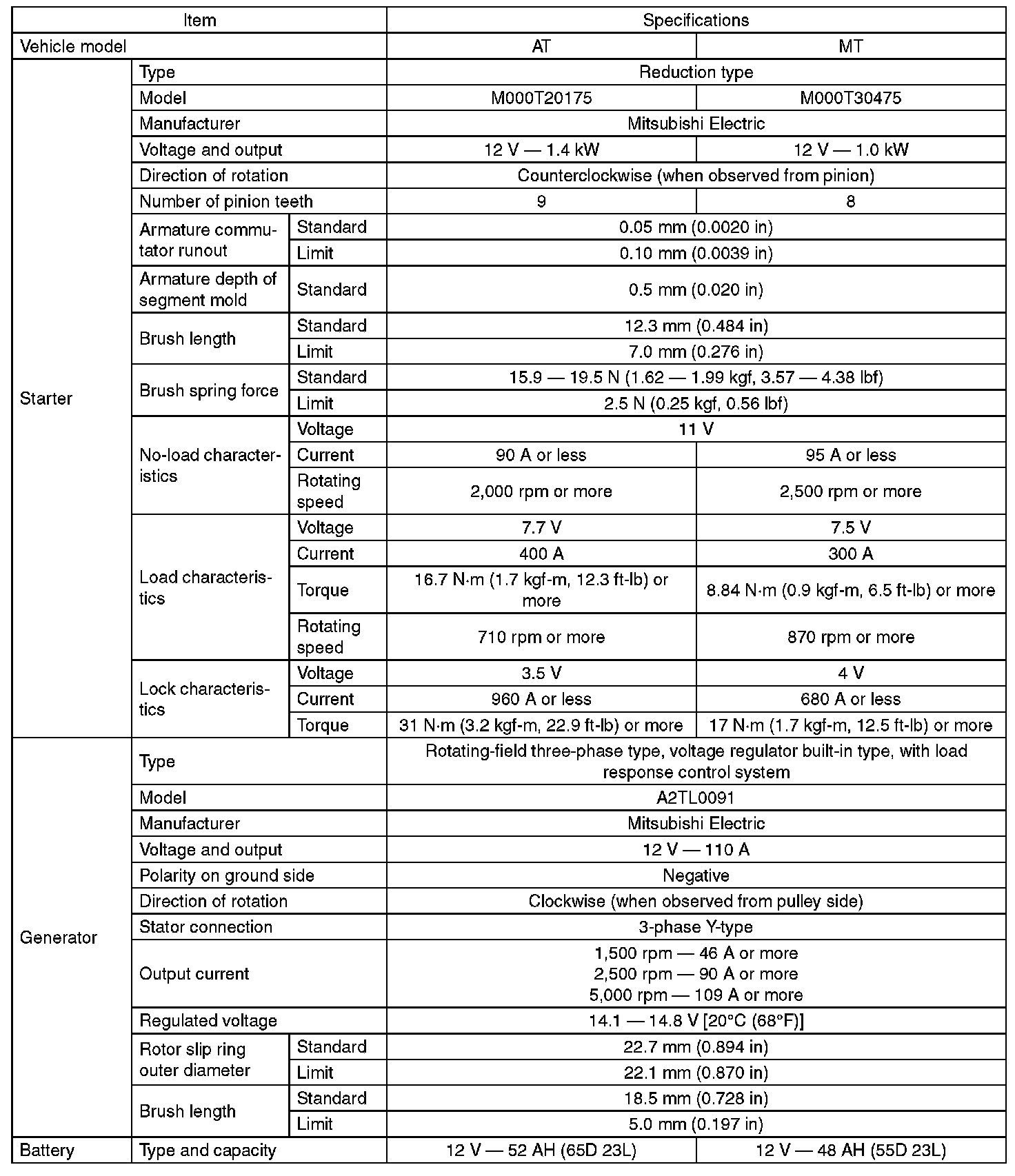 Starting and Charging: Specifications