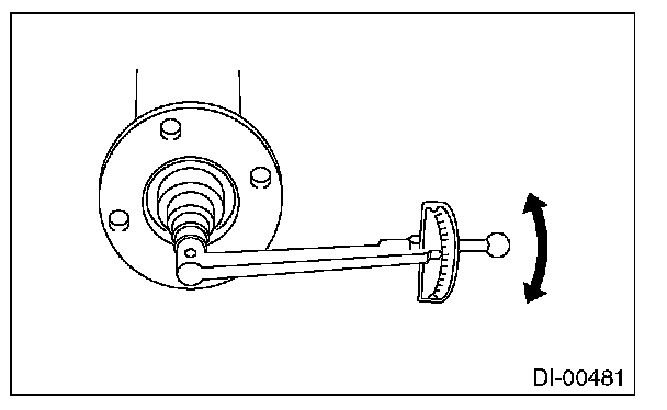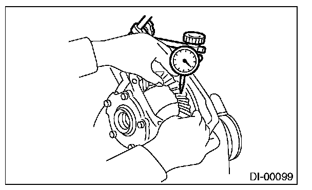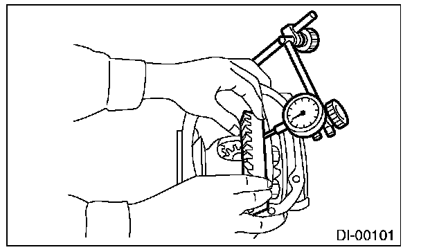 18) Check the runout on the back side of the hypoid driven gear, and make sure that the pinion and hypoid driven gears rotate smoothly. If the runout on the back side of the hypoid driven gear exceeds the specification, check for any foreign material between the hypoid driven gear and differential case, and for any deformation of the case or gear.