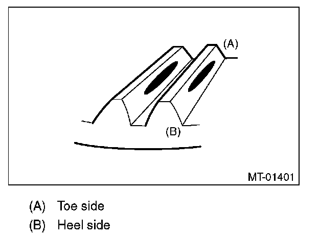 Check item: Tooth contact pattern is slightly shifted toward toe side under no-load rotation. (When driving, it moves towards the heel side.)