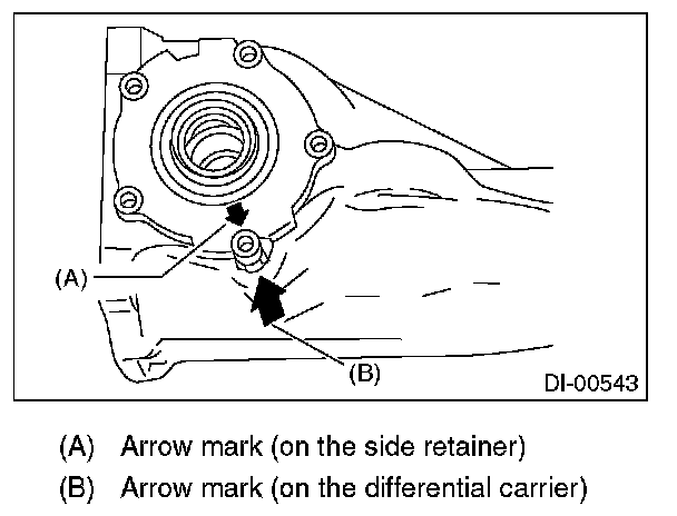 (4) Align the arrow mark on the differential carrier with the arrow mark on the side retainer when installing the side retainer.