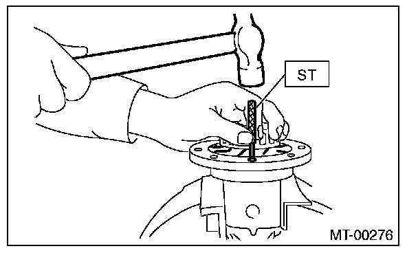 3) Align the pinion shaft and differential case with each hole, and drive the straight pin into the holes from the hypoid driven gear using the ST.