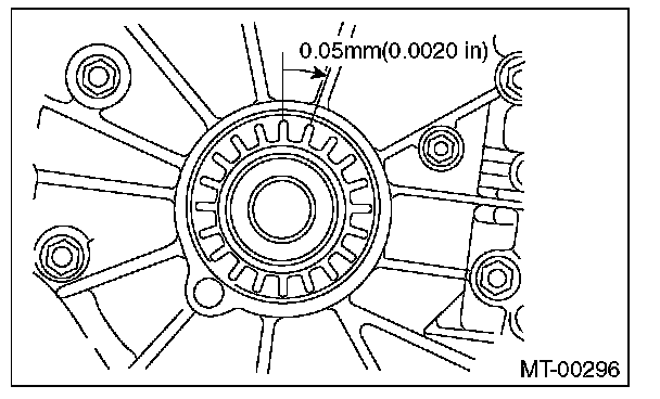 2) Install SUBARU genuine axle shafts to both sides, rotate in the inversion direction so that the gauge contacts the tooth surface, and read the dial gauge