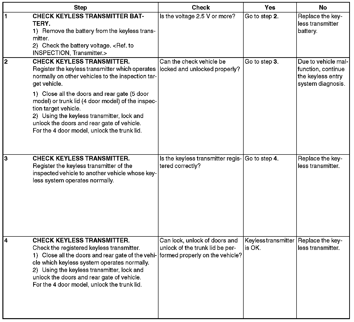 Keyless Entry SystemCHECK KEYLESS TRANSMITTER BATTERY AND FUNCTION