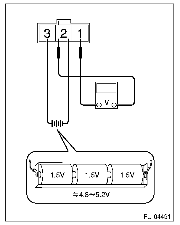 2. Connect dry-cell battery positive terminal to terminal No. 3 and dry-cell battery ground terminal to terminal No. 2, circuit tester positive terminal to terminal No. 1 and the circuit tester negative terminal to terminal No. 2.