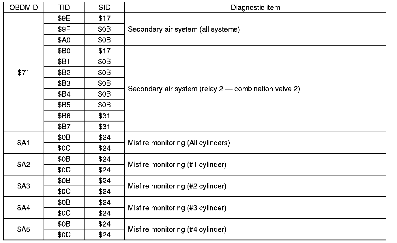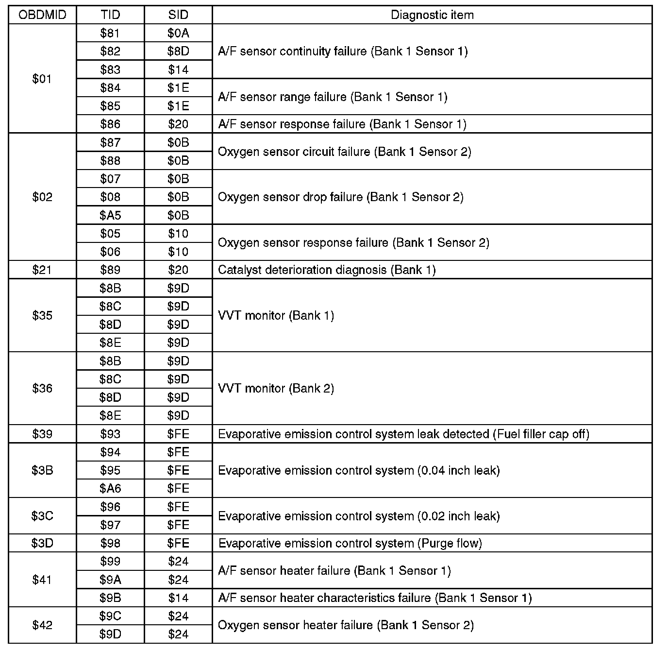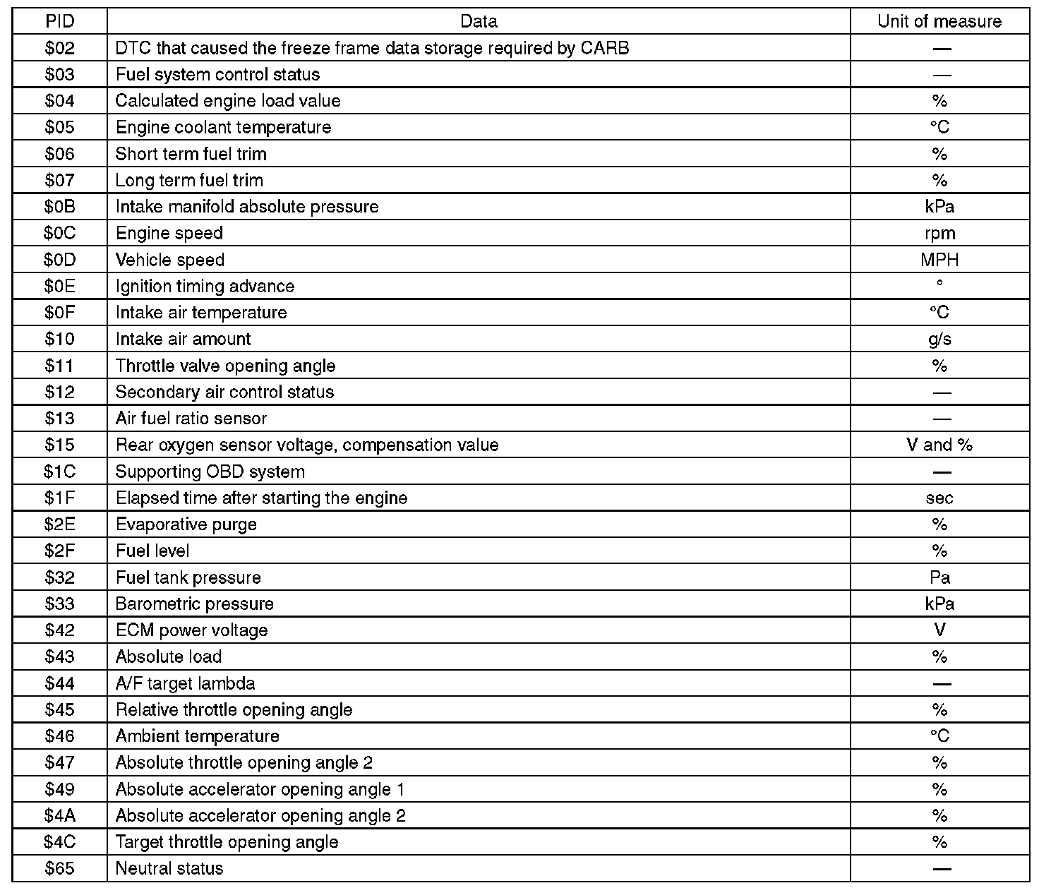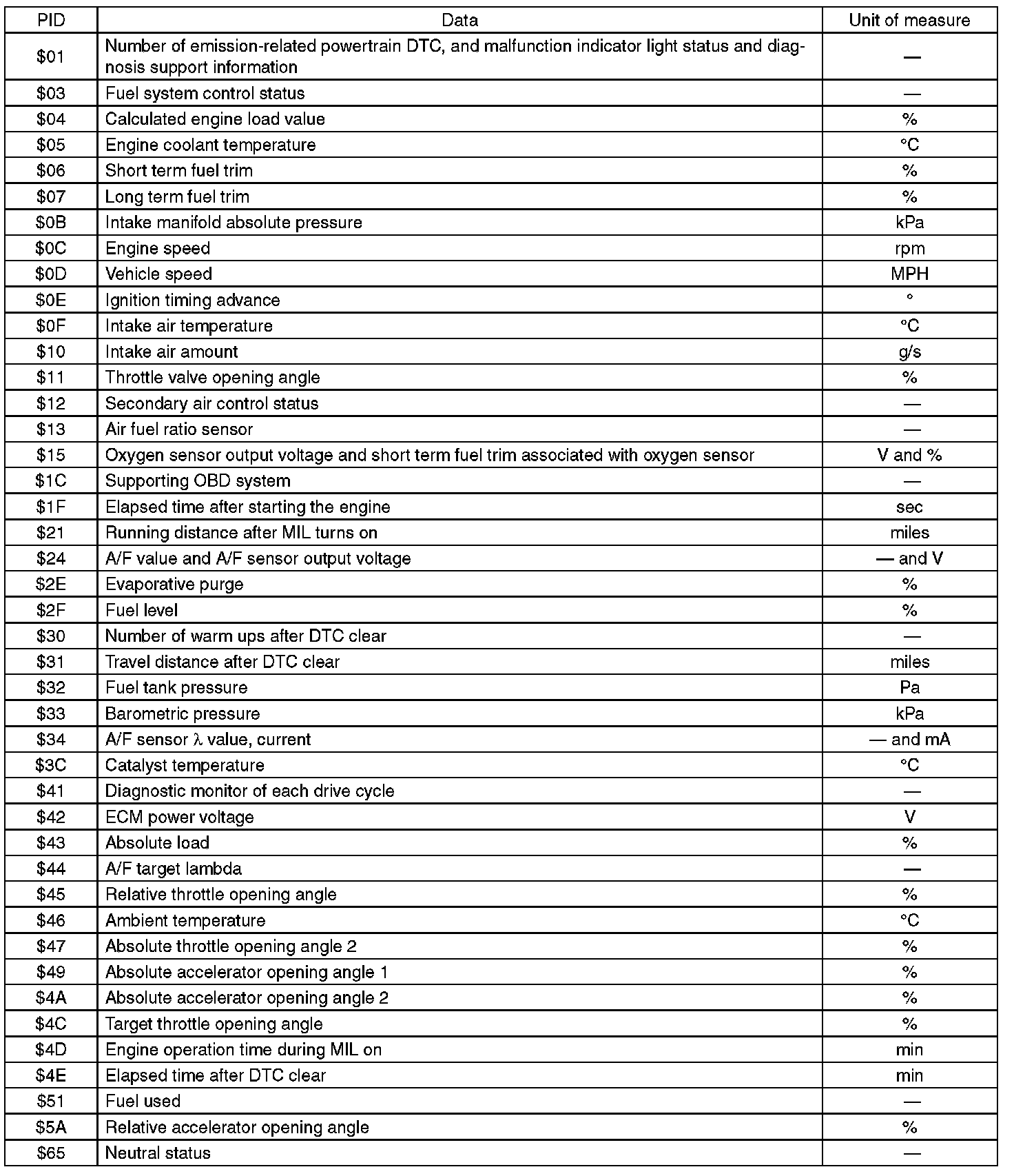 A list of the support data and PID (Parameter Identification) codes are shown in the following table.
