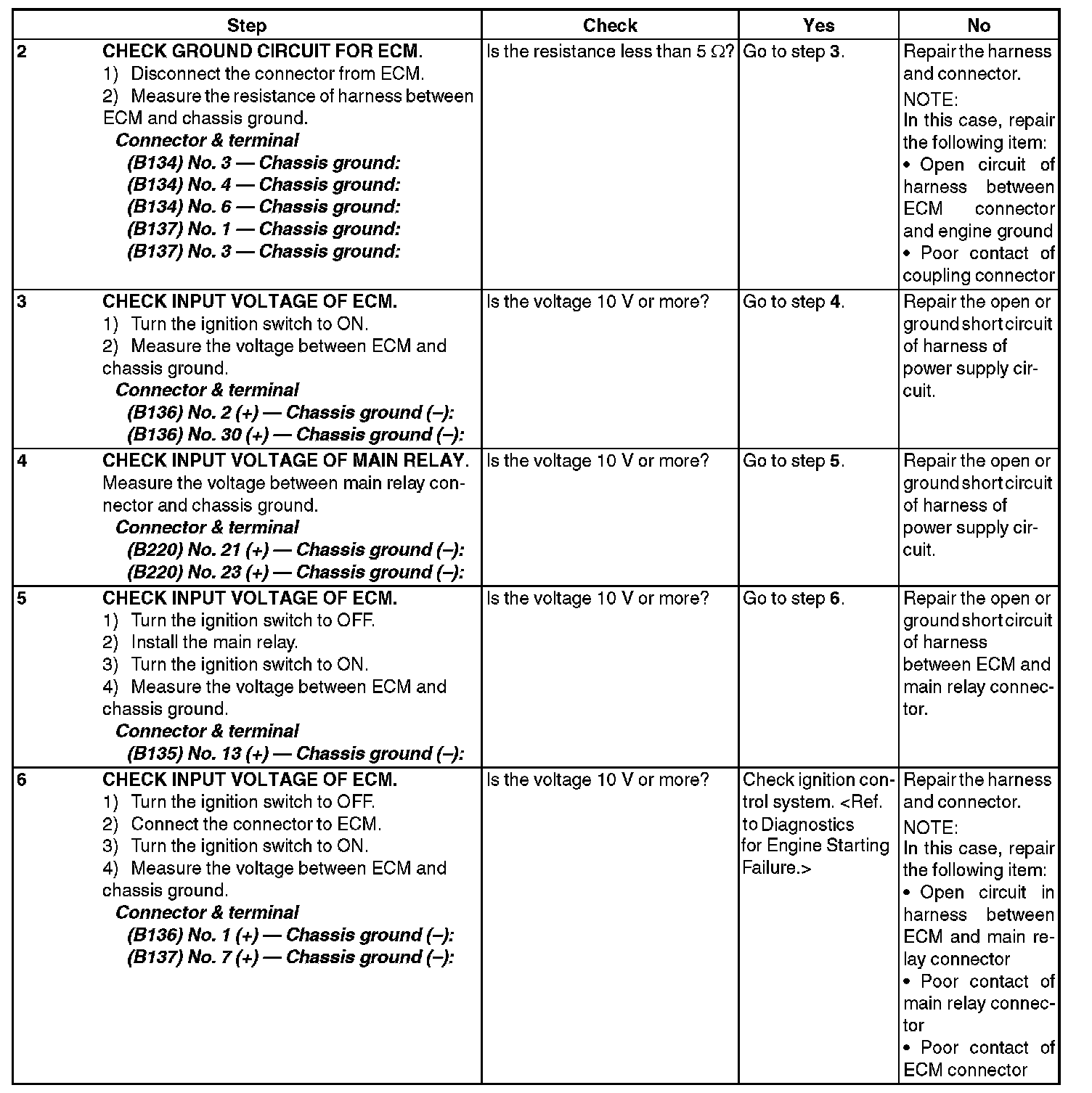 CHECK POWER SUPPLY AND GROUND LINE OF ENGINE CONTROL MODULE (ECM)CAUTION: After servicing or replacing faulty parts, perform Clear Memory Mode Clear Memory Mode, and Inspection Mode Preparation For the Inspection Mode.