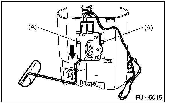 4. Press two claws (A) of the fuel level sensor, and slide the fuel level sensor in the direction of the arrow to remove the fuel level sensor.