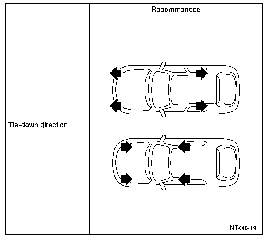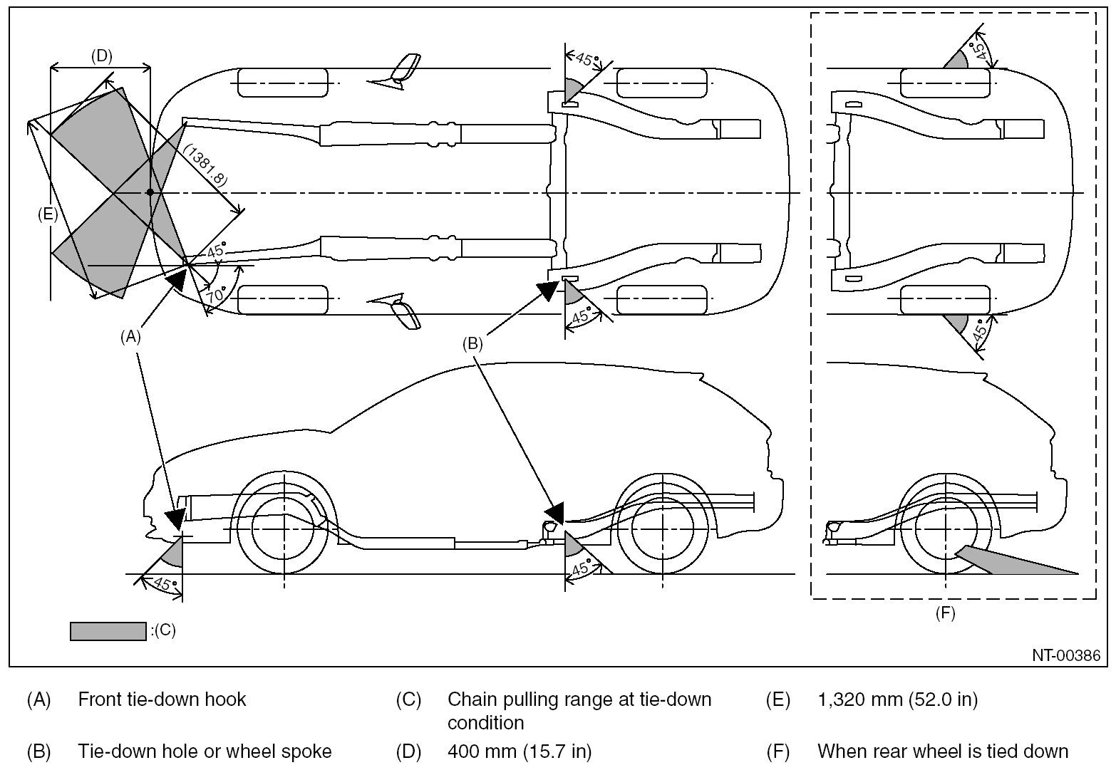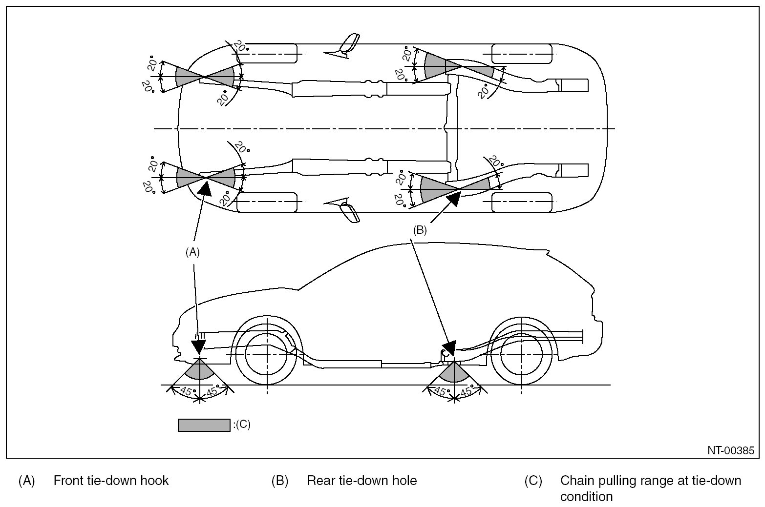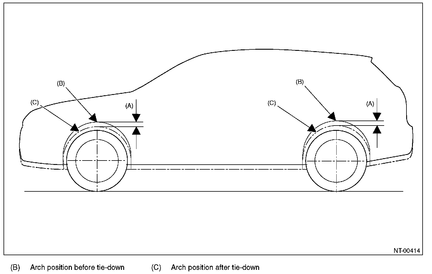CAUTION: The vehicle sinking volume at tie-down condition should be less than 50 mm (1.97 in) and make sure to fix the vehicle securely.Check to see if the tensions of chains or belts at tie-down condition are appropriate in the following procedures.