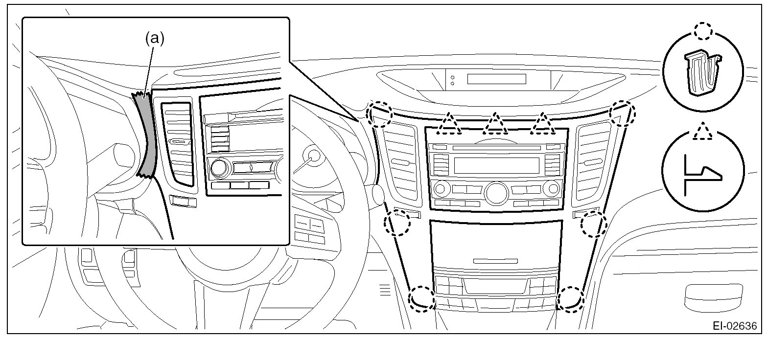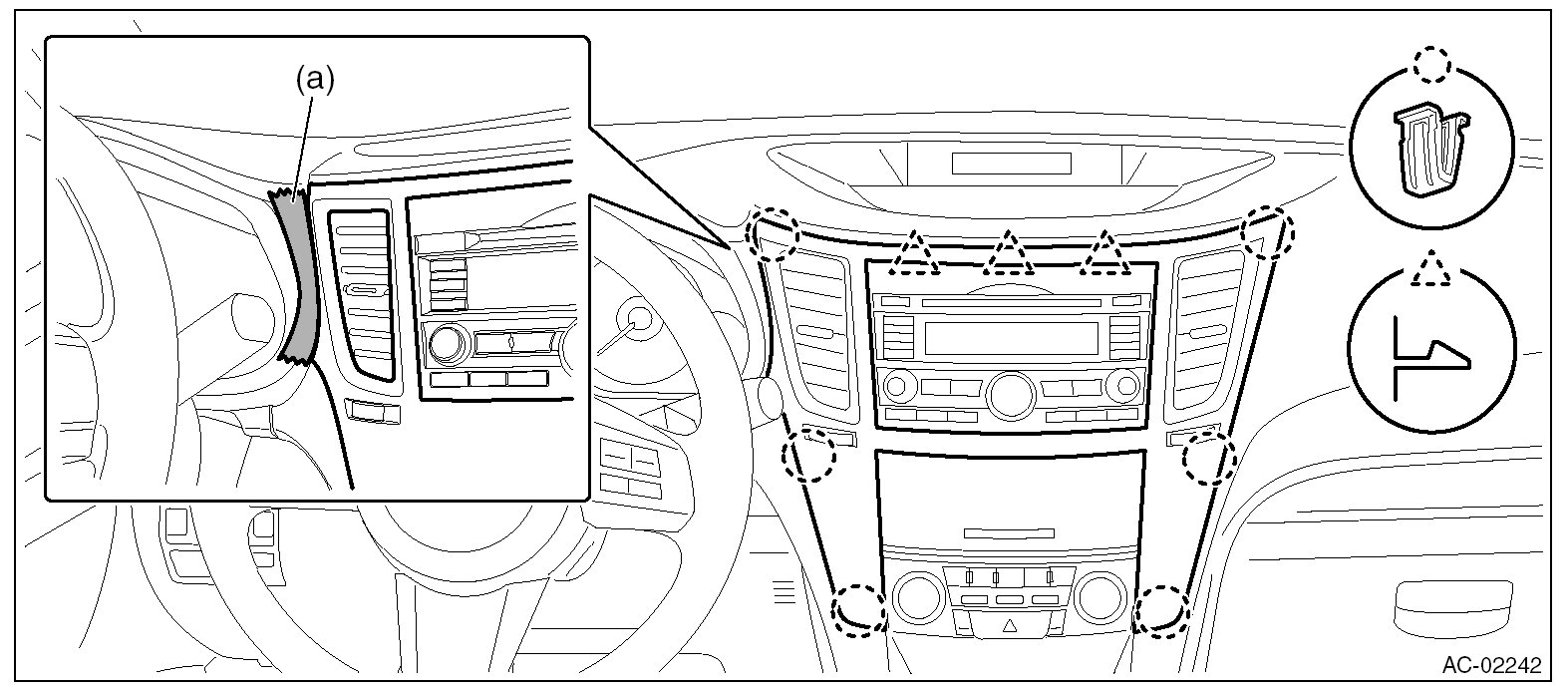 2. Insert a finger into the air vent grille and release the left and right clips at the top of the center panel. (A), (B)